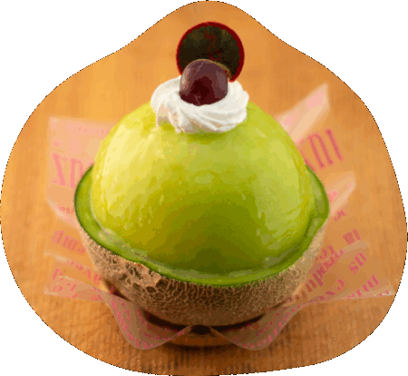 半カットしたメロンの器の中に、ロールケーキ、